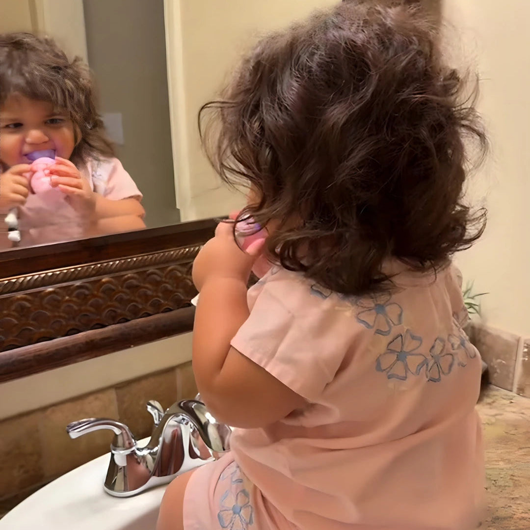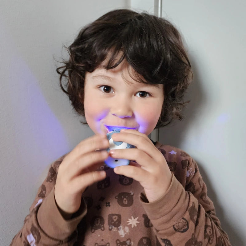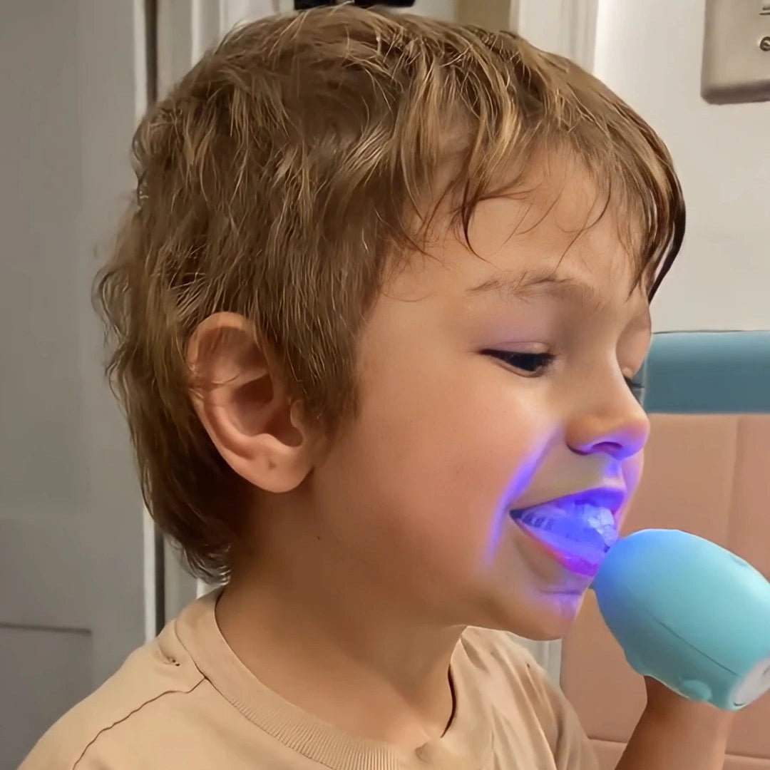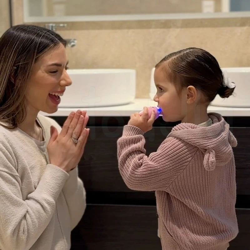 Dein Kind nimmt ihn selbst, beißt sanft darauf und lächelt, während er leise summt – und alle Zähne gleichzeitig reinigt. Kein Bitten mehr. Keine Tränen. Nur 60 ruhige Sekunden, ein glückliches Kind und ein gutes Gefühl für dich.